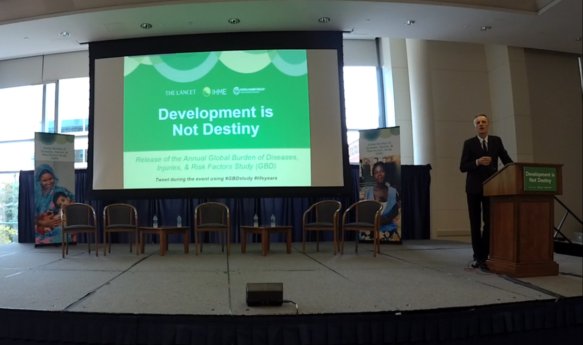 Event collateral (quickscreens, podium signs, nametags, stage backdrop, etc.) for a research institute’s “Global Burden of Diseases” report launch at George Washington University, co-hosted by The World Bank and The Lancet.